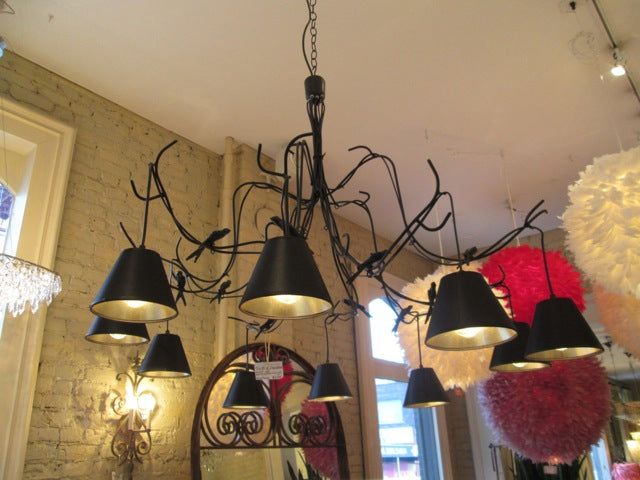 TRIANONMade in France, this chandelier features 10 cast bronze birds perching on composite metal branches finished with an ultra black lamp shade with gold film interior shades.